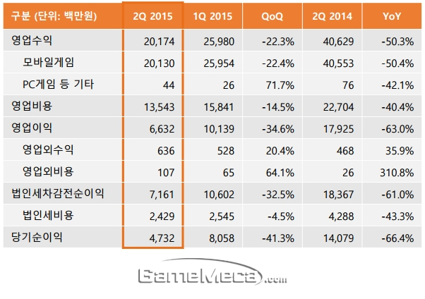 선데이토즈가 7일, 자사의 2015년 2분기 실적을 발표했다. 매출은 전년 동기 대비 50% 감소한 202억 원을 기록했으며, 영업이익은 전년 동기 대비 63% 줄은 66억 원으로 나타났다. 당기순이익은 47억 원으로 전년 동기 대비 66% 감소했다.