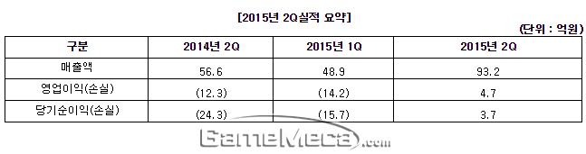 ▲ 와이디온라인 2015년 2분기 실적 비교표 (사진제공: 와이디온라인)