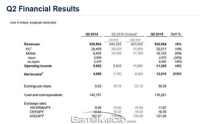 이와 함께 넥슨 2015년 상반기 실적도 함께 공개됐다. 매출은 946억 3,600만 엔(한화로 8,549억 원), 영업이익과 순이익은 355억 3,900만 엔(한화로 3,030억 원), 315억 4,900만 엔(한화로 2,850억 원)에 달한다. 매출은 2014년 상반기 대비 12%, 영업이익과 순이익은 각각 8%, 56% 늘었다.