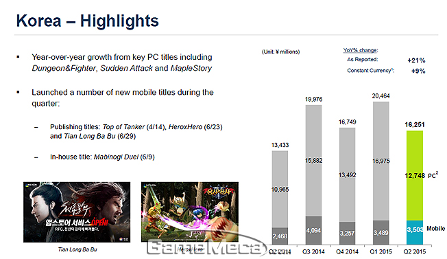 한국에서도 지난 4월 출시된 ‘탑 오브 탱커 for Kakao’가 모바일게임 매출을 견인했으며, ‘던전앤파이터’, ‘서든어택’, ‘메이플스토리’ 등 기존 온라인게임도 건재했다. 넥슨 2015년 2분기 한국 매출은 전년 동기 대비 21% 늘어난 162억 5,100만 엔에 달했다. 넥슨은 “2분기 출시작 중 ‘용사X용사’, ‘천룡팔부’ 등은 6월에 출시되어 실적이 한 달 밖에 반영되지 않았다. 여기에 ‘마비노기 듀얼’ 등은 6월 이후 출시됐다. 따라서 이들의 실적은 3분기부터 본격 반영될 것으로 보인다”라고 말했다.
