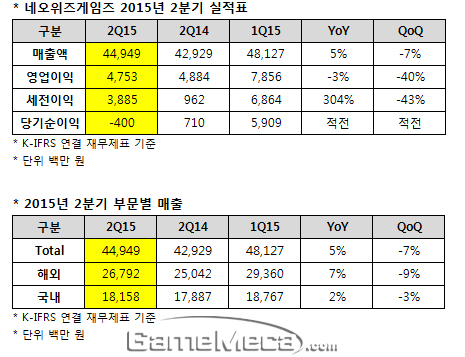 ▲ 네오위즈게임즈 2015년 2분기 실적 (자료제공: 네오위즈게임즈)