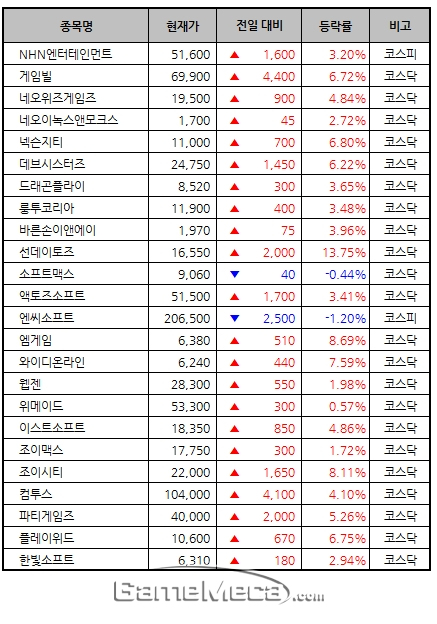 가장 큰 폭으로 상승세를 보인 곳은 선데이토즈다. 오는 26일 사전등록 30만 명을 기록한 신작 ‘상하이 애니팡’ 간담회가 진행되는 만큼, 남북관계 해소에 신작에 대한 기대감까지 더해지며 전일 대비 13.75% 상승한 16,550원을 기록했다. 이외에도 엠게임(8.69%), 와이디온라인(7.59%), 조이시티(8.11%) 등이 7%가 넘는 상승세를 보였다.