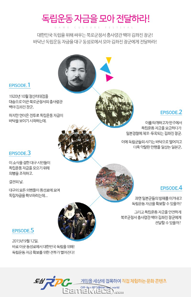 총 5개의 에피소드로 구성된‘도심 RPG’는 바닥난 독립운동 자금을 대구 동성로에서 모아 백야 김좌진 장군에게 전달하는 것이 목표다. 또한 수행 과정에서 대구시의 풍경과 주요 명소 등을 감상할 수 있다.