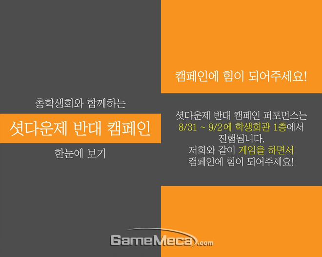 포항공대 총학생회는 ‘게임 셧다운제 반대 캠페인 퍼포먼스’의 일환으로, 지난 8월 31일 오후 8시부터 9월 2일 오후 8시 10분까지 48시간 게임 릴레이 방송을 진행했다. 이 봉상은 포항공개 학생회관에서 진행됐으며, 학교 측의 주장에 반박하는 내용과 다양한 게임 플레이 시연 영상으로 구성됐다.