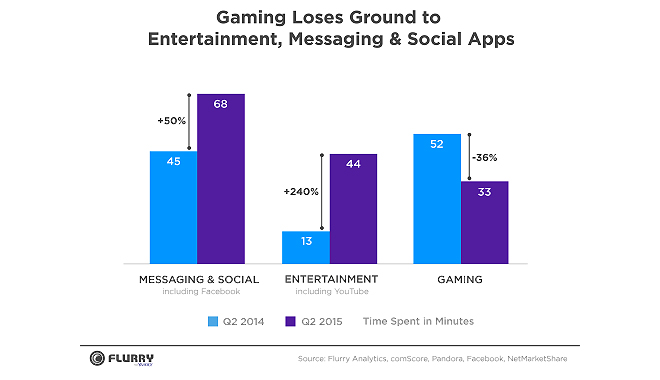 그 외에 스마트폰으로 게임을 이용하는 시간 자체가 줄어든 탓도 있다. 지난달 28일, 플러리가 발표한 미국 소비자 스마트폰 사용시간 자료에서 찾아볼 수 있다. 자료에 따르면, 미국 소비자의 스마트폰 사용시간은 35% 증가했으나 게임 이용 시간 비율은 36% 감소한 것으로 나타났다. 반면 영상 스트리밍이나 SNS 사용 시간은 50% 이상 증가했다.