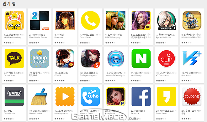 ▲ 2015년 9월 9일 구글 플레이 인기 앱 순위