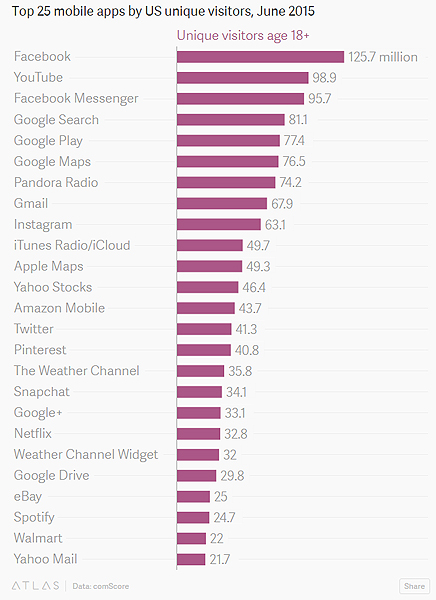 미국 인터넷 마케팅 연구기업 컴스코어(ComScore)는 8일(현지시간), 미국인이 가장 많이 이용하는 모바일 앱 순위를 발표했다. 조사 대상은 18세 이상 성인으로, 2015년 6월 한 달 동안 이루어졌다.