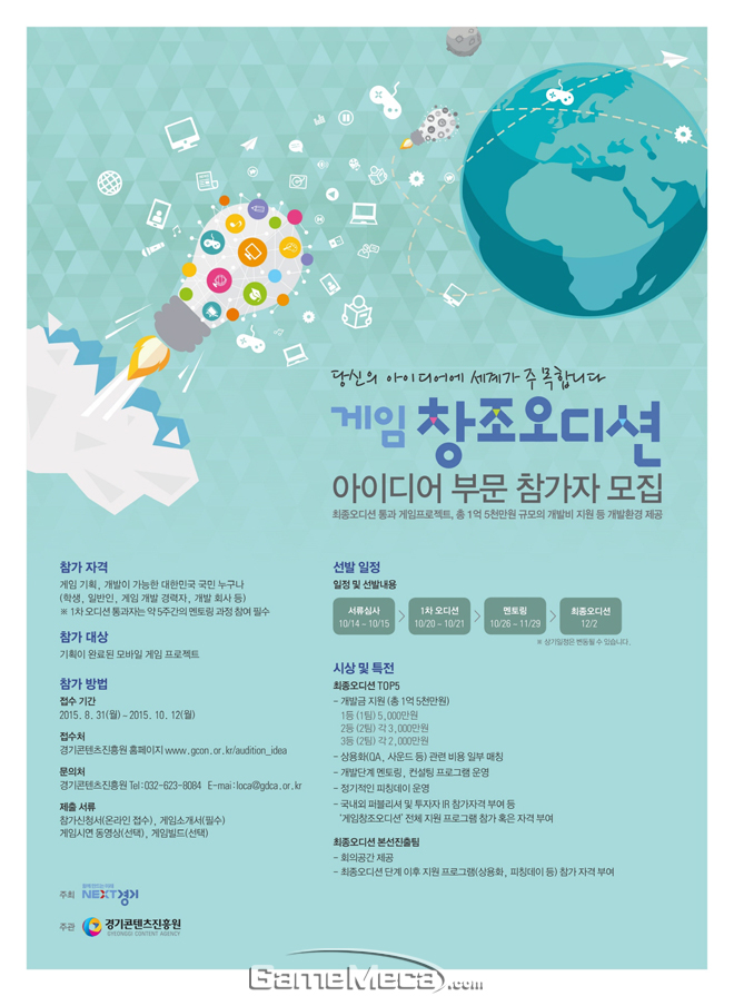 게임 창조 오디션은 지난 6월 30일 개최됐던 상용화 부문 오디션과 달리 아이디어 단계에 있는 모바일 게임 프로젝트가 모집 대상이다.