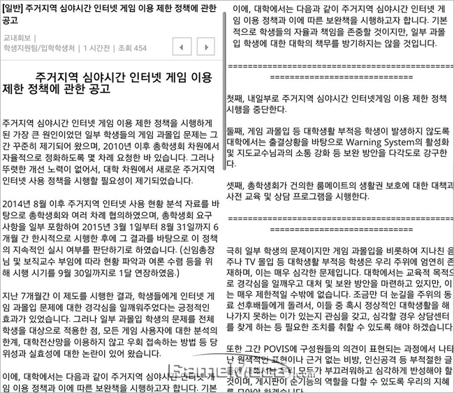 기숙사에 거주하는 학생의 심야 게임을 전면 중단하는 ‘셧다운제’를 실시하던 포항공대가 제도 중단을 결정했다. 일부 학생의 문제를 전체를 대상으로 한 점, 스마트폰 태더링 등 우회접속을 막을 수 없다는 것 등 당위성과 실효성이 부족하다는 점에 학교와 학생 모두가 공감해 결정된 것이다.