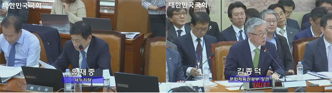 ▲ 7일 열린 문체부 국정감사에서 질의 중인 유재중 의원과 답변 중인 김종덕 장관