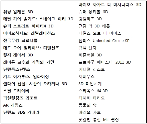 게이머라면 누구나 무료로 입장이 가능한 `3DS 체험회` 에 출품되는 게임 목록은 다음과 같다. (굵은 글씨로 표기된 타이틀은 체험 가능)