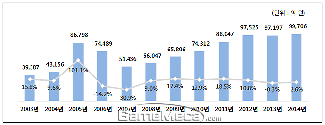 한국콘텐츠진흥원(KOCCA)이 10월 발간한 '2015 대한민국 게임백서'에 따르면, 지난해 국내 게임시장은 전년도와 비교해 2.6% 성장해 매출액 규모가 9조 9,706억 원에 달했다. PC방 및 아케이드게임장 등 유통·소비업을 제외한 매출액은 8조 7,024억 원(83억 100만 달러)이다.