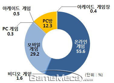 온라인․모바일게임 등 일부 분야에 시장이 집중되는 현상은 여전했다. 온라인게임이 5조 5,425억 원 규모로 55.6%의 비중을 차지했고, 모바일게임과 PC방이 각각 29.2%와 12.3%의 점유율로 2조 9,136억 및 1조 2,277억 원 규모였다. 이들 세 분야가 전체 게임 시장에서 차지하는 비중은 97.2%로 전년(97.1%)과 비슷했다.