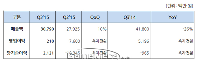 전년 동기 대비 매출은 26.3% 감소했으나, 영업이익과 당기순이익은 각각 104%와 319% 증가하며 흑자전환에 성공했다. 이는 3분기에 ‘미르의 전설 2 모바일’ 중국 로열티 매출 발생으로 모바일게임 매출이 상승했고, 기존 모바일, 온라인 게임들도 꾸준한 매출을 보인 덕분이다.