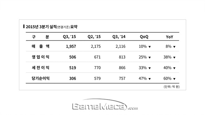 ▲ 엔씨소프트 2015년 3분기 실적 비교표 (사진제공: 엔씨소프트)