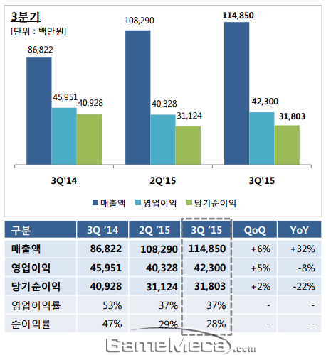 컴투스는 10일(화), 3분기 실적을 발표했다. 매출은 1,149억 원을 기록해 전년 동기 대비 32% 증가했다. 영업이익은 423억 원으로, 전년 동기 대비 8% 감소했다.