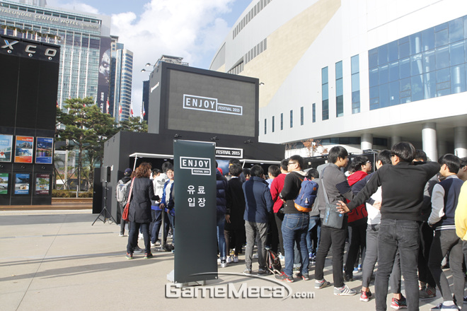 상대적으로 힘이 빠진 지스타 2015 B2C에 화력을 더해준 주인공은 넥슨과 피파가 공동으로 주최한 'ENjoy 페스티벌'인 것으로 보인다. 실제로 지스타 일정이 시작된 12일 오전부터 'ENjoy' 페스티벌 입장을 기다리는 참가자들이 줄을 길게 늘어선 모습을 확인할 수 있었다.