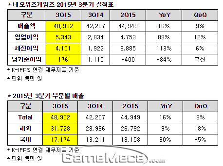 ▲ 네오위즈게임즈 2015년 3분기 실적 (자료제공: 네오위즈게임즈)