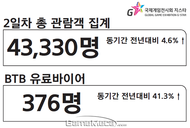 이 수치는 순수 지스타 B2C관에 입장한 관람객만 집계한 것이다. 전년 동 기간에 비했을 때 큰 폭으로 상승한 것은 아니나 둘째날에는 비가 오는 악천후에도 불구하고 예년 수준 관람객을 유지한 점은 긍정적으로 평가된다.