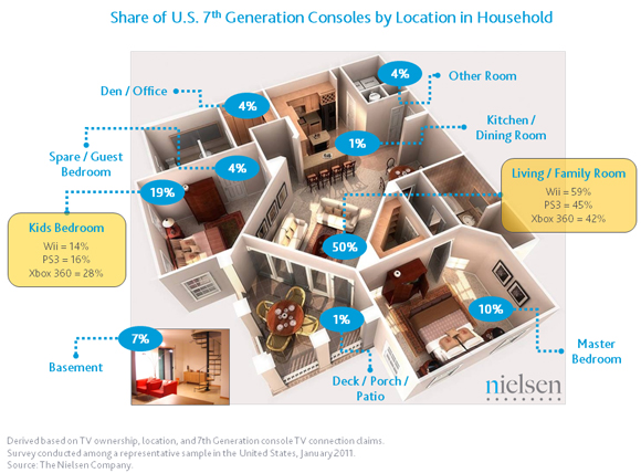 닐슨이 공개한 자료에 따르면, 게임기가 가장 많이 설치된 곳은 거실로 50%, 그 다음 아이의 침실이 19%, 안방이 10%, 지하실이 7%, 서재/오피스, 손님방, 그 외가 각각 4%, 주방과 안뜰이 1%로 조사됐다. 또, 각각 어떤 게임기가 놓여져 있는지에 대한 순위 조사는, 거실에 가장 많이 놓여져 있는 것은 Wii가 59%, 그 뒤로 PS3, Xbox360 순으로 나타났다. 반면에 아이의 침실에 놓여져 있는 것은 Xbox 360이 28%로 가장 많았으며 PS3와, Wii가 뒤따르고 있다.
