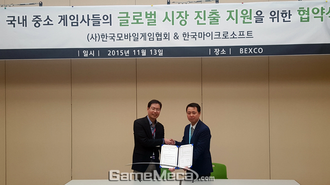 한국모바일게임협회는 지난 13일, 부산에서 열린 지스타 2015 현장에서 한국마이크로소프트와 양해각서를 체결하고 한국 모바일 게임 산업 발전과 글로벌 진출, 윈도우 스토어 사업 활성화에 양사가 힘을 모으겠다고 밝혔다.