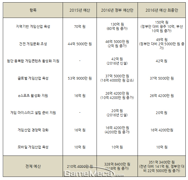 2016년 예산이 지난 3일 의결됐다. 내년 예산은 게임산업 육성 예산은 351억 3,400만 원으로2015년보다 67%가 늘어났다. 올해보다 150억 원 가까이 늘어난 게임 예산은 과연 어느 사업에 얼마나 투입될까? 게임메카는 문화체육관광부 게임콘텐츠산업과 및 국회로부터 상세한 내역을 전달받아 2016년 게임산업 예산이 어떻게 쓰이는가를 조사했다.
