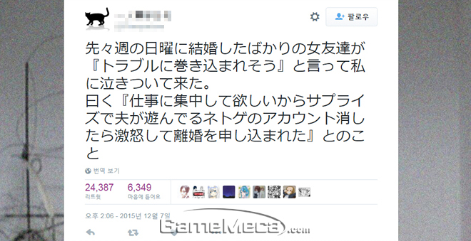 지난 8일(화), 트위터에 한 일본인 사용자가 얼마 전 결혼한 친구가 남편에게 이혼 통보를 받았다고 털어놨다. 결혼한지 이제 2주 남짓, 그 어느 때보다 행복해야 할 신혼부부가 파경을 맞은 이유는 무엇일까? 문제의 아내는 남편이 게임에만 몰두하지 말고, 조금 더 일에 집중해줬으면 하는 마음에서 게임 계정 삭제를 감행했다고 한다. 이에 격분한 남편이 곧장 이혼을 요구했다는 것.