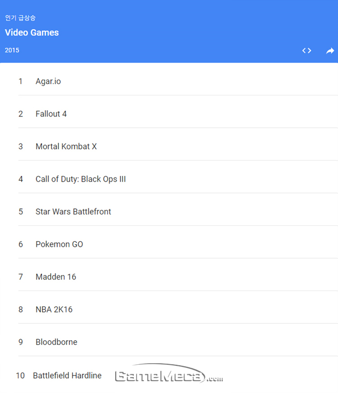 구글은 22일(현지시간), 구글 트렌드 웹사이트를 통해, 2015년 게임 검색어 인기 차트 TOP 10을 공개했다. 검색어 순위는 유저들이 구글에서 가장 많이 검색한 순으로 집계됐다.