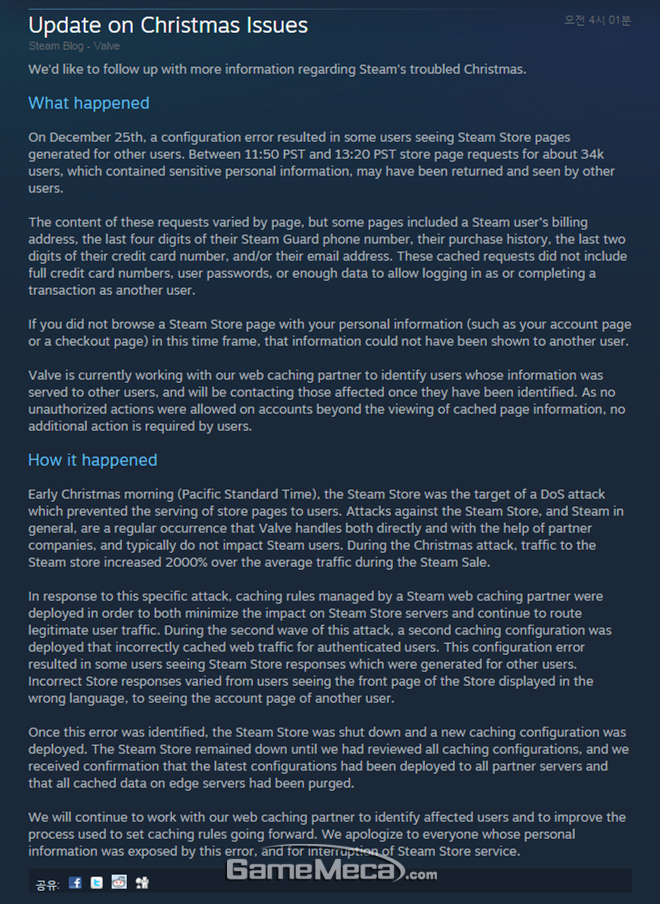 ▲ 스팀 성탄절 사태 사과문 전문 (사진출처: 공식 웹사이트)