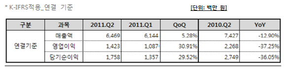 2011년 2분기는 전 분기 대비 연결기준 매출액 및 영업이익과 순이익이 각각 5%, 31%, 30%가 증가해, 연결기준 매출액은 65억 원, 영업이익 14억 원, 순이익 18억 원을 기록했다.