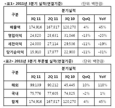 부문별 매출로는 해외 991억 원, 국내 758억 원으로 나타났다. 해외 매출 991억 원은 전 분기 대비 10% 성장한 것으로 전체 매출의 57%를 차지했다. `크로스파이어`가 중국 동시접속자수 300만명을 돌파하였고, 일본 자회사 게임온의 대표 타이틀로 자리매김한 `아바`가 선전한 성과로 보인다.