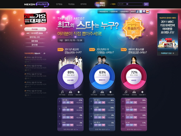 넥슨은 ‘넥슨 뮤직’ 서비스 페이지에서 ‘2011 MBC 가요대제전’ 방송 당일 인터넷 생방송 독점 중계를 진행하며, 다양한 공동 프로모션을 오는 31일까지 실시한다.